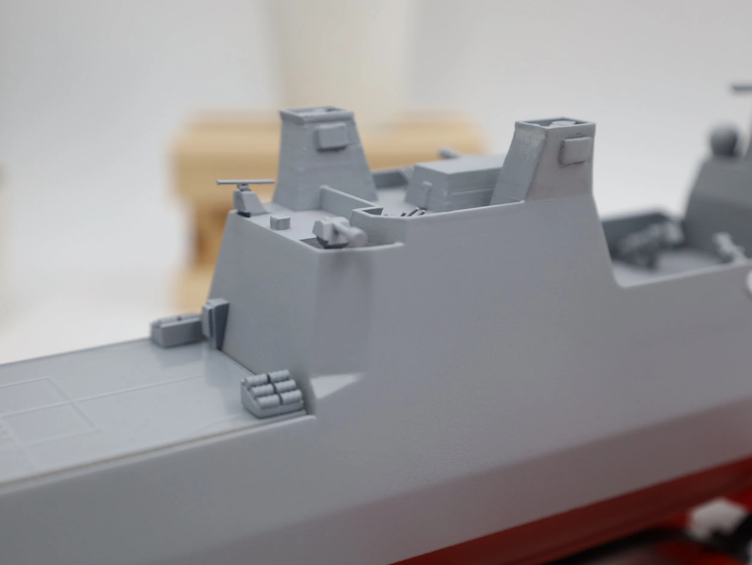 We produced the ship’s hull using high resolution 3D printing to achieve clean curvature and correct proportions. Key weapon systems, such as deck cannons and missile racks, were fabricated as separate components for sharper detail and easy assembly.