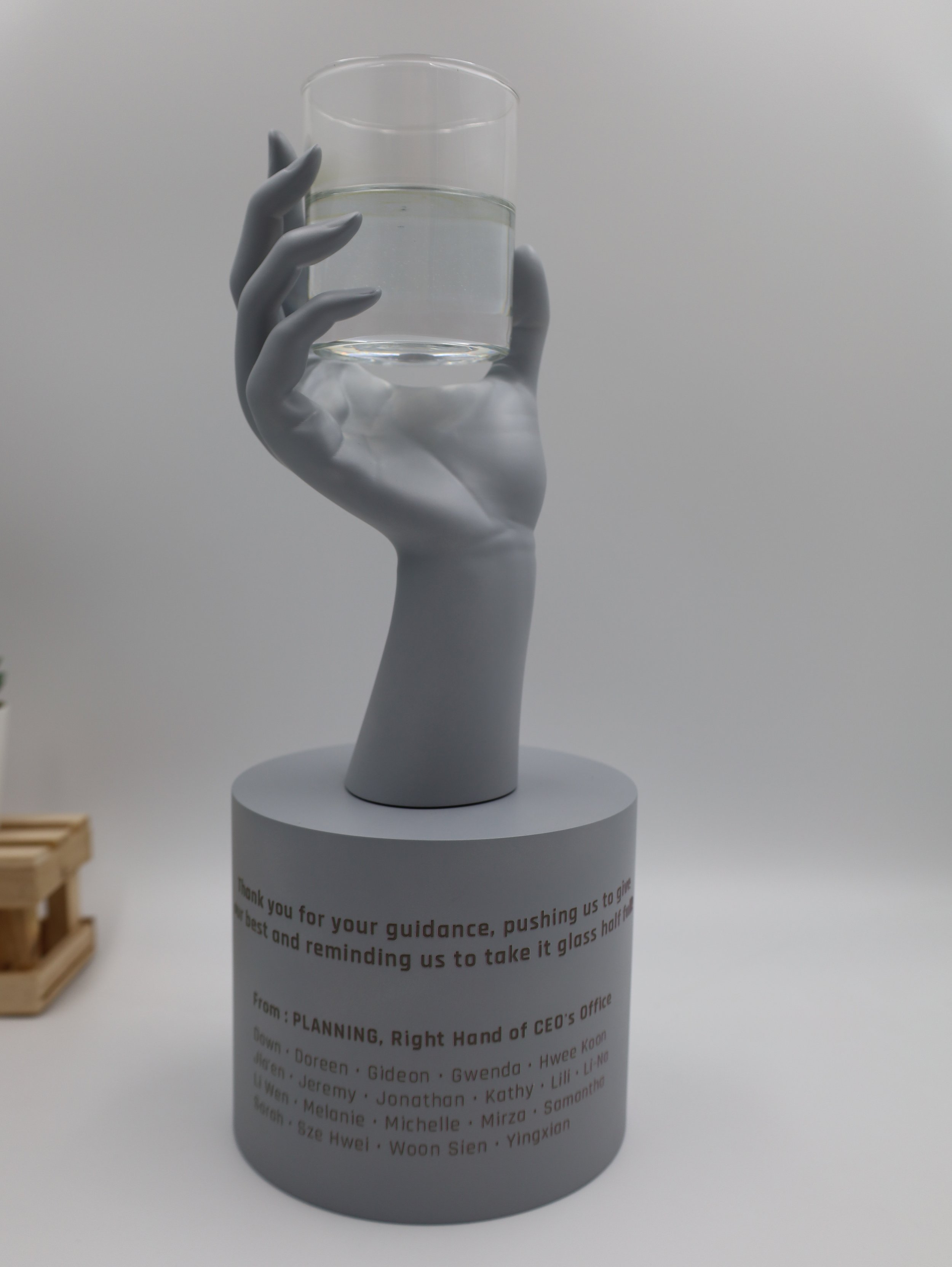 For this personalised appreciation project, the client wanted a meaningful display piece that conveys positivity, gratitude, and guidance. The concept centered on a symbolic “glass half full” message, represented through a sculpted hand holding an actual glass cup. The gift needed to be visually striking, emotionally expressive, and built to last.